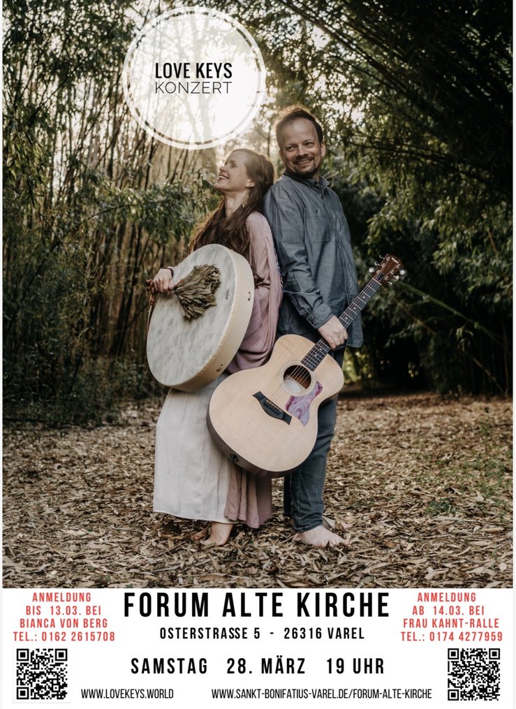 Am 28. März, tritt im Forum Alte Kirche um 19 Uhr das Duo The Love Keys auf und sorgt mit einer einzigartigen Kombination aus hingebungsvollem Gesang, kraftvollen Mantras und atmosphärischen Soundlandschaften für einen unvergesslichen Abend. Mit über 1.000 Live-Auftritten in 15 Ländern sind Aleah und Ben eine feste Größe in der internationalen Mantra- und Yoga-Musikszene. Ihr Stil, Conscious Pop, ist geprägt von Tiefe, Intuition und Verbindung. Die Konzerte von The Love Keys sind nicht nur musikalische Darbietungen, sondern auch Räume für Stille, Energie und Begegnung. Tickets im VVK 25 Euro, AK 30 Euro, Vorbestellungen bis 13. März unter 01622615708 (Bianca Von Berg) und ab dem 14. März bei Edith Kahnt-Ralle unter 01744277959.